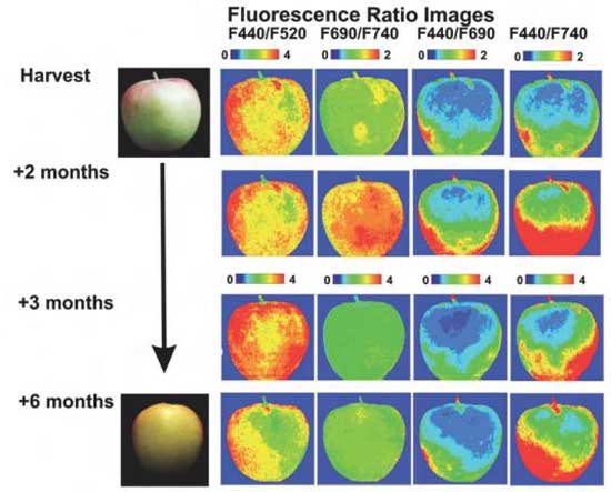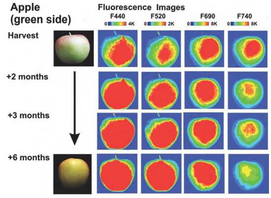 荧光光谱技术用于农产品水果和蔬菜的检测,近年来发展迅速,具有无损、快速、准确性高的优点。激光诱导荧光应用于农产品等相关领域的检测是一种新兴的检测方法,在水果和蔬菜的检测中具有独特的优势。由于荧光寿命反映了荧光光子衰减的长度,仅与激发光强度有关,不受环境光、荧光散射等因素的影响,具有良好的稳定性。激光诱导荧光高光谱技术应用于水果内部质量无损检测,可准确预测水果内部质量的快速、准确的检测和分类。