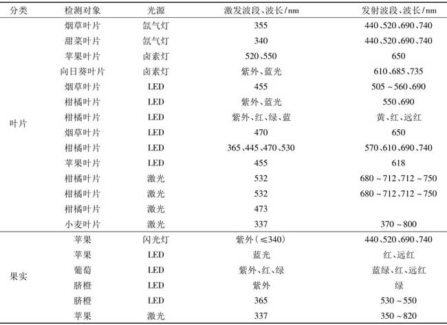 表1分别列出了国外荧光光谱和荧光成像技术在植物叶片和果实病害检测中的应用研究,总结了响应激发光源、波段和荧光发射波段。从这些研究中可以发现,在叶片检测方面,基于卤素灯、氙气灯和LED灯的激发波段可以有多种选择。虽然绿光和红光也被使用,但它们通常集中在紫外线和蓝光的范围内,而基于激光的激发波长固定在同一装置中,并集中在蓝光和绿光的范围内。但无论使用哪种光源,叶片的荧光发射波长都集中在红光波段,即叶绿素荧光;在果实检测中,激发波段或激发波长集中在紫外线范围内,而荧光发射波段的分布不集中在某一波段内。