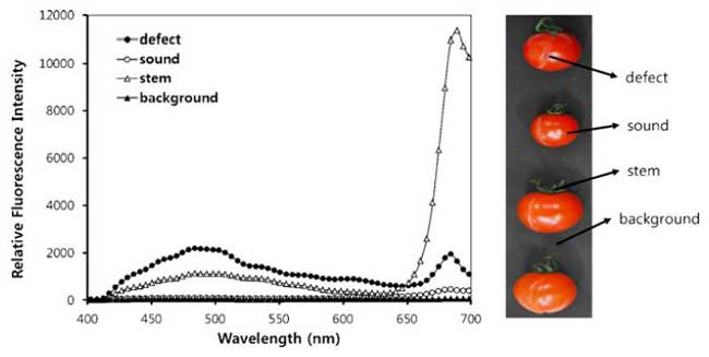 在国外,ColinD.Everard采用荧光成像和高光谱成像技术检测菠菜表面污染物,.采用最优波段比的荧光成像对污染物的检测精度高于可见近红外高光谱。LichtenthalerHK利用荧光成像系统在储存过程中测量苹果的荧光图像。随着储存时间的增加,苹果的蓝绿荧光强度继续增加,并扩展到整个苹果表面。Byoung-Kwancho采用荧光高光谱检测小西红柿的皮肤损伤。荧光高光谱以365nm紫外线灯为光源,结合EMCCD相机和瞬时荧光(IFOV)收集小番茄的荧光图像,发现蓝光区域表皮损伤的荧光图像非常明显。通过PCA提取的最佳荧光波长结合方差分析,检测小番茄损伤的准确性大于99%。IvanSimko采用高光谱和叶绿素荧光成像技术研究新鲜切菜的腐烂,从高光谱图像中获取(LEDICF)在叶绿素荧光图像中获得(LEDI4)检测指标,结合这两个指标,生菜腐烂检测的准确率高达97%。利用荧光高光谱成像技术检测西红柿表面的粪便污染,通过PCA和BRI处理西红柿表面的污染区和未污染区图像,灰度图像可以清楚地区分污染区和未污染区,结果表明BRI优于PCA处理,最佳波段比为705nm和815nm。Wulf和其他激光激发波长为337nm,获得远红外、红、绿、蓝波段苹果和胡萝卜的荧光光谱,分析了苹果和胡萝卜在储存过程中新鲜度的变化。结果表明,苹果在蓝绿色波段产生的荧光受叶绿素等多酚的影响,远红色和红色波段产生的荧光仅受叶绿素的影响,胡萝卜的蓝色波段荧光受类胡萝卜素的影响,基于最小二乘回归法的荧光特性与色素含量模型的相关系数达到0.99。