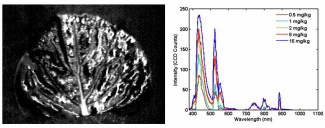 图4 农药浓度为 8mg/kg 叶菜样品的高光谱荧光图像及不同浓度梯度样品的荧光光谱曲线