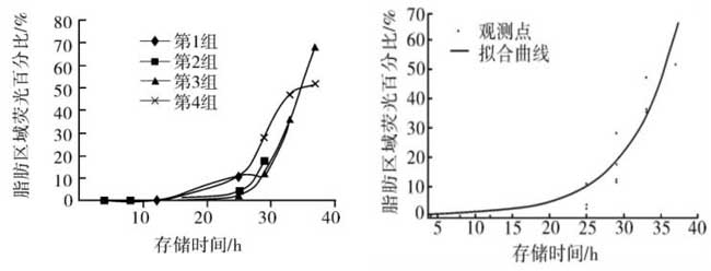 图5 肉脂肪区域荧光百分比增长趋势及脂肪区域荧光百分比随存储时间指数规律增长曲线拟合